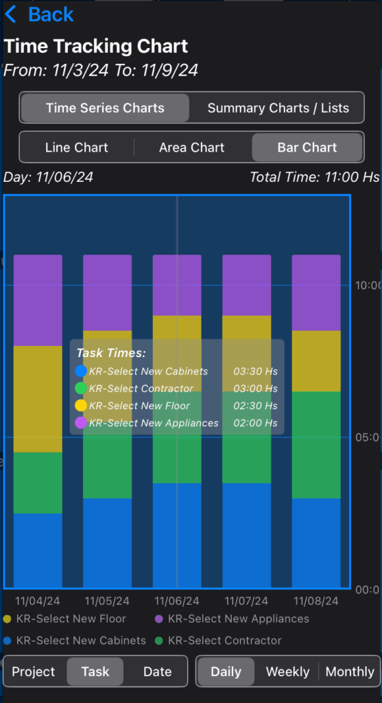 - The Date Period and Total Time are presented when you select a particular date period by touching upon the chart area.